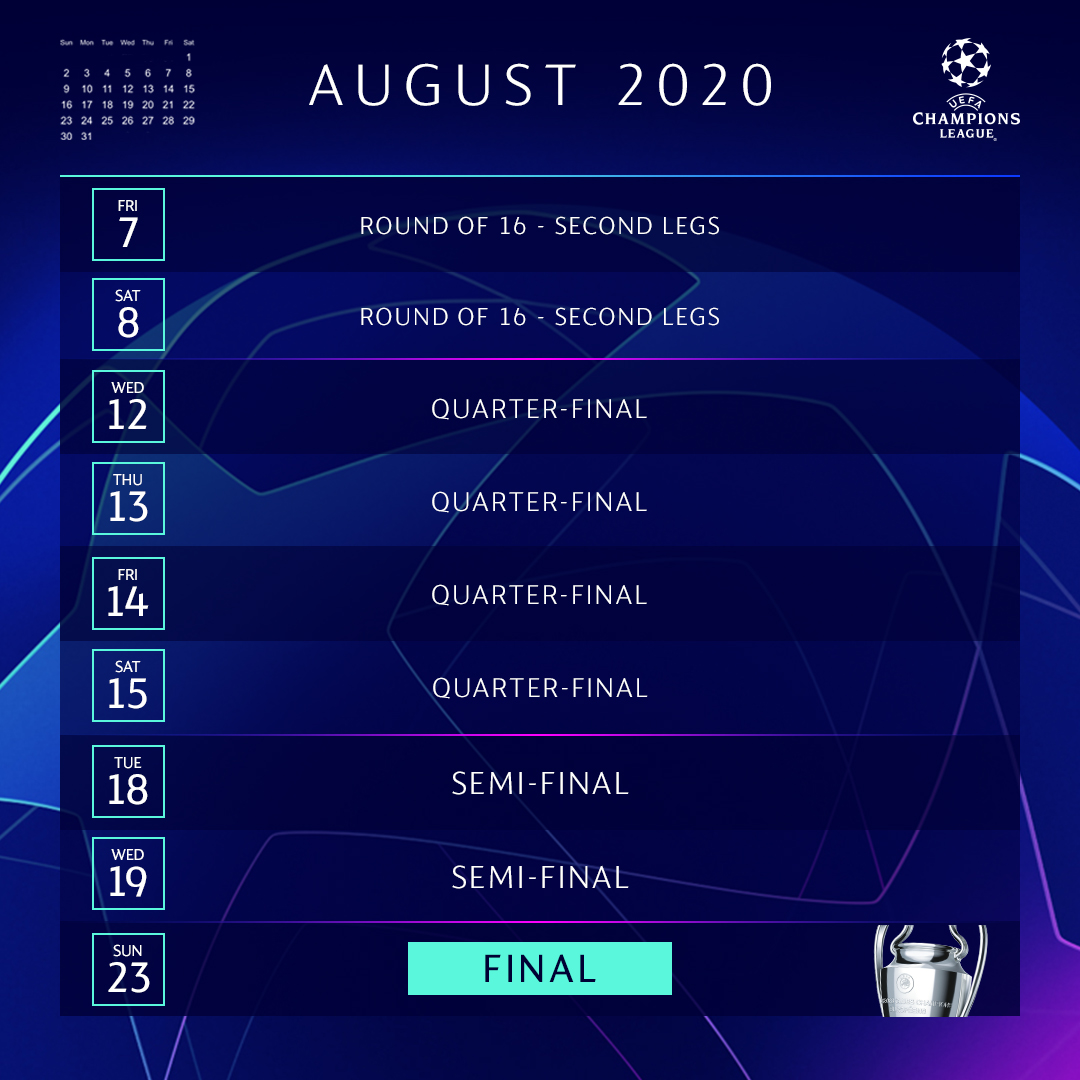 Los partidos pendientes de octavos de final, Bayern Munich-Chelsea, Barcelona-Napoli, Manchester City-Real Madrid y Juventus-Lyon, se disputarán el 7 y 8 de agosto.