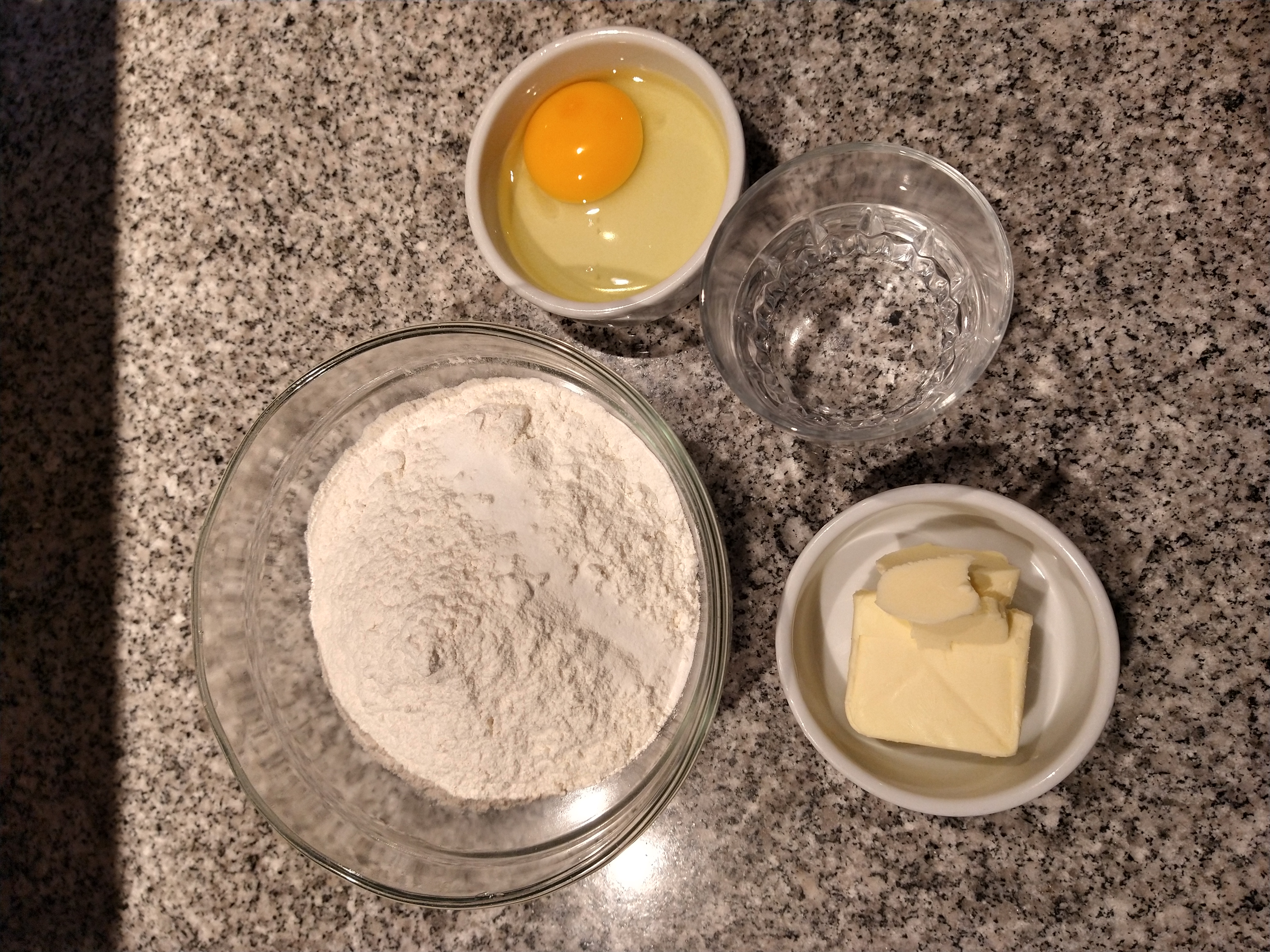 Realizar una corona con el harina y la sal fina. En el centro colocar el huevo, agua tibia y la manteca derretida. Comenzar a amasar hasta lograr una buena masa lisa y homogénea. Colocar en un bowl y dejar descansar por 1 hora, tapada.