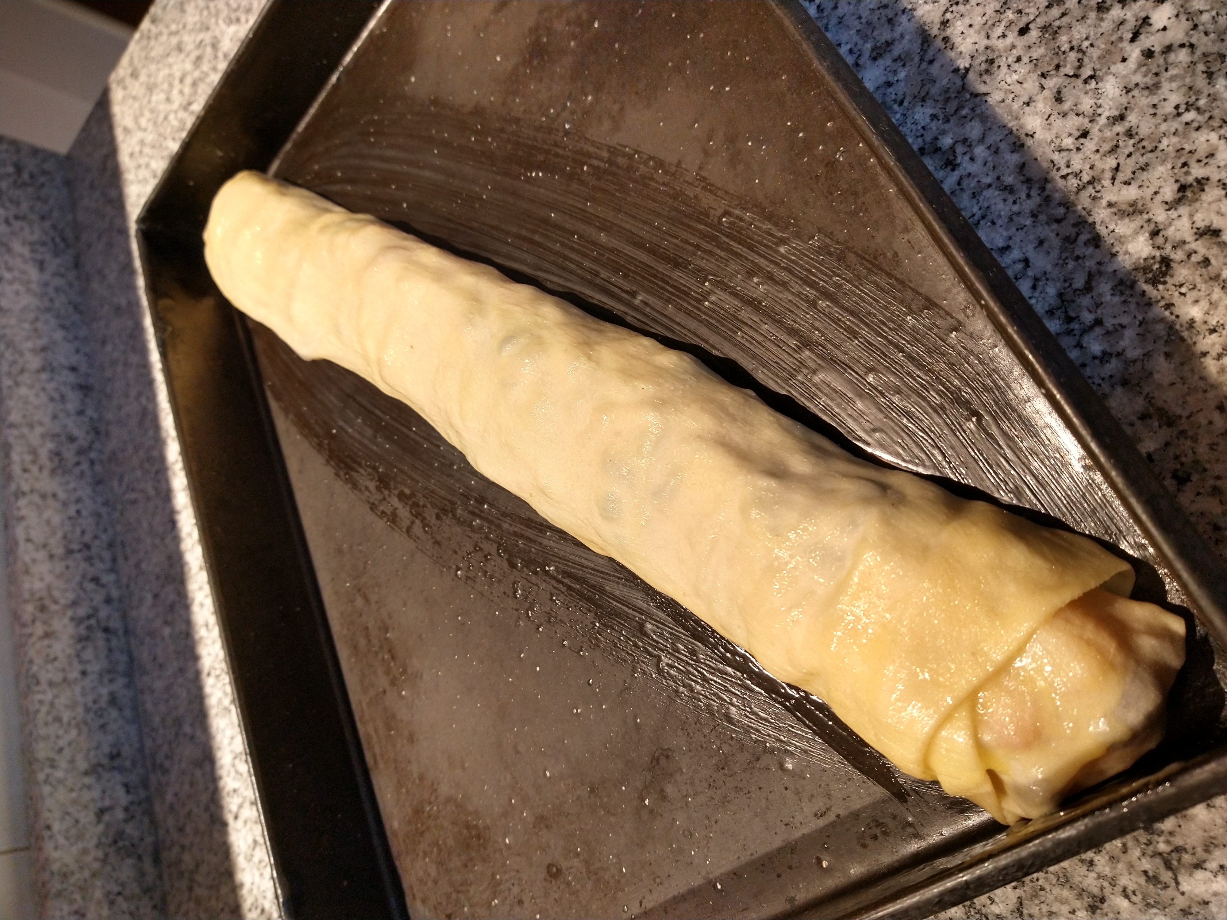Doblar los extremos hacia adentro y comenzar a enrollar. Colocar el strudel crudo sobre una placa engrasada (manteca, aceite o rocío vegetal) y pincelar por encima con manteca derretida.