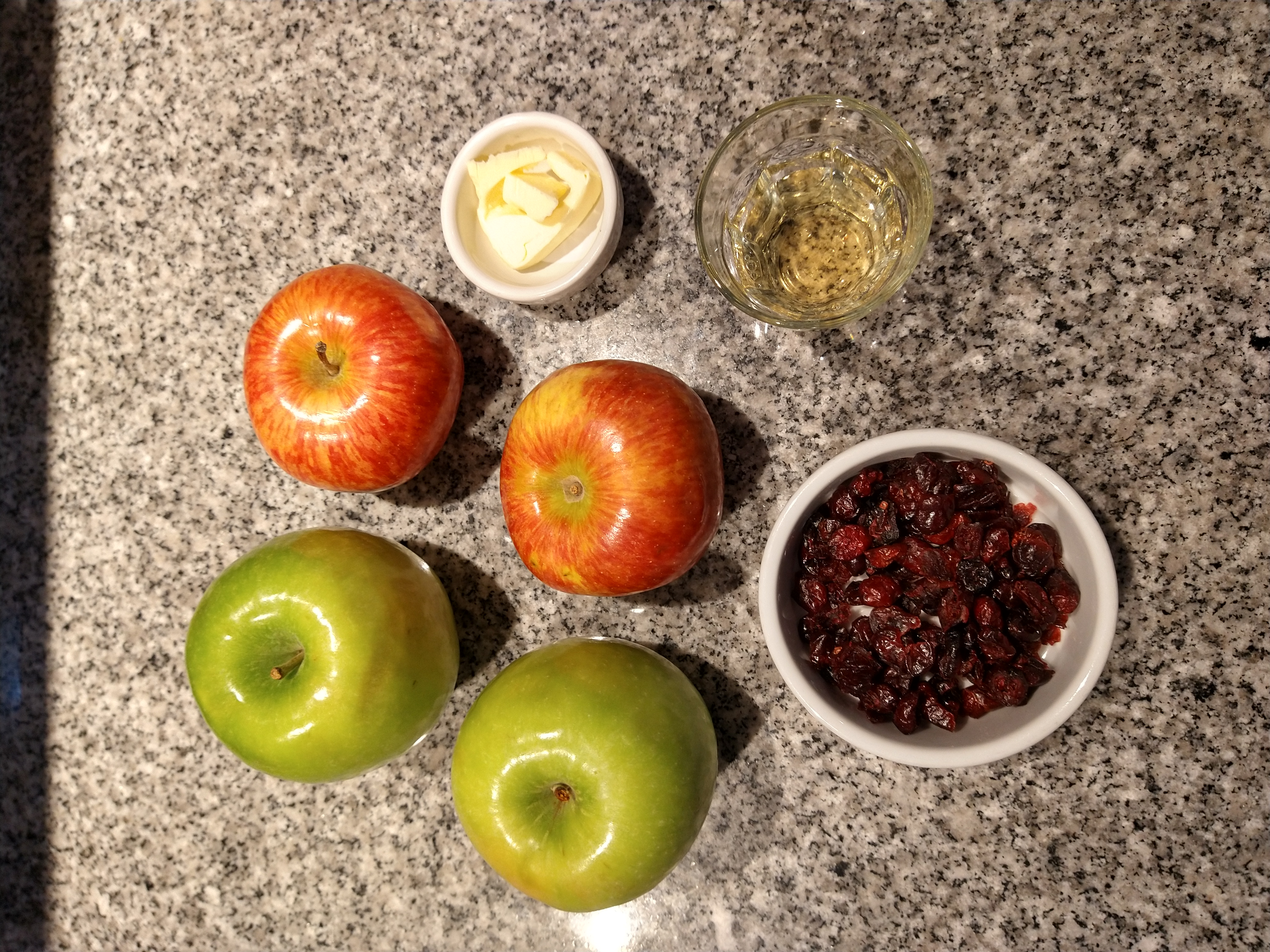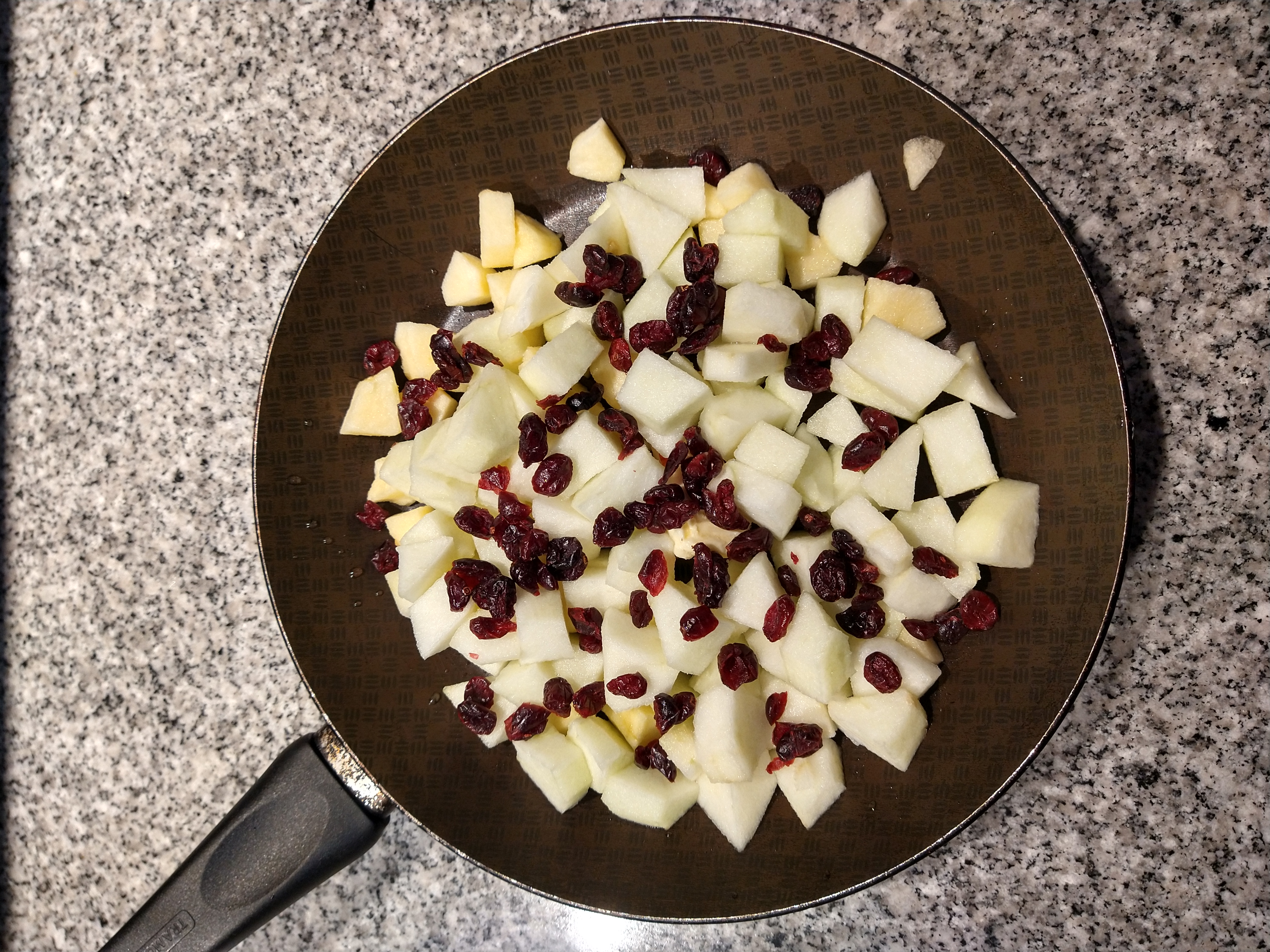 Pelar, retirar las semillas y cortar en cubos las manzanas. En una sarten u olla colocar el cubo de manteca y dejar que derrita sobre el fuego. Agregar los cubos de manzanas, las pasas de arándanos y el vino. Cocinar unos minutos a fuego bajo hasta que la manzana este tierna. Dejar enfriar y si quieren poner una pizca de canela.