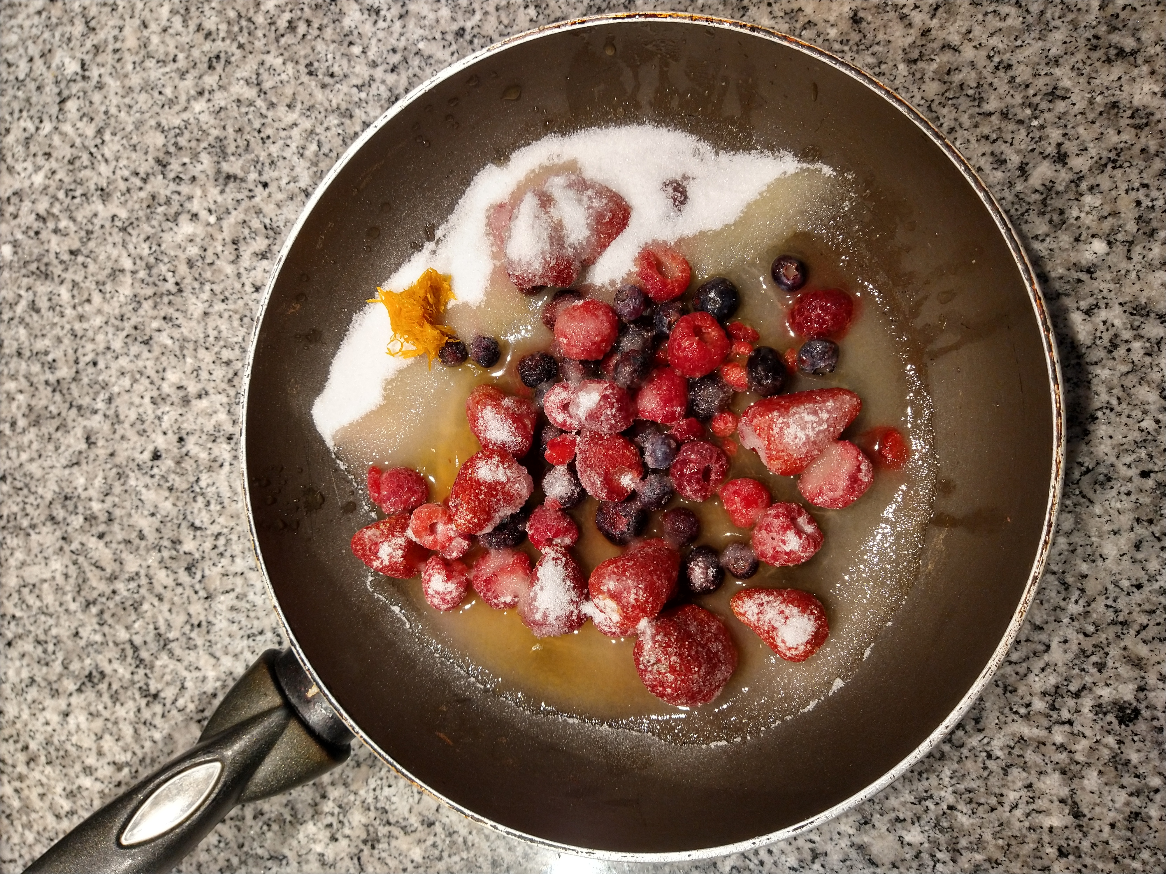 Colocar los frutos en una sartén u olla, junto con el jugo y la ralladura de naranja y el azúcar.