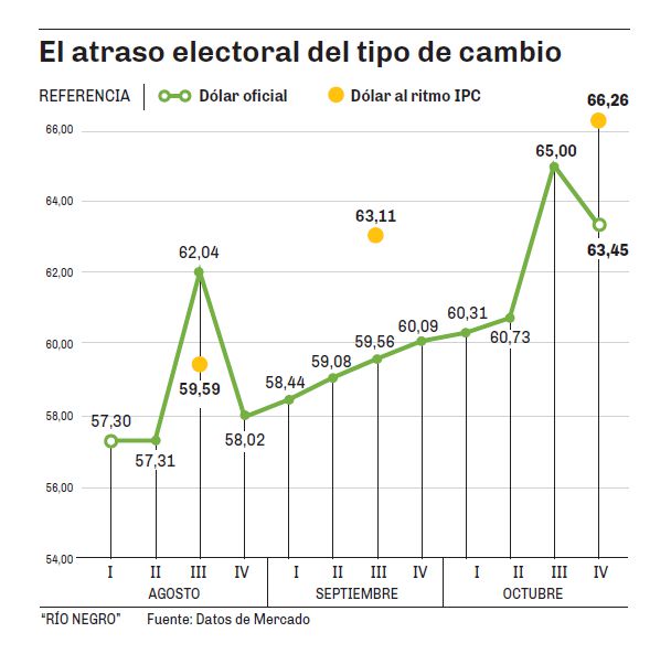 Pero además, el cepo ligth de septiembre, volvió a generar atraso cambiario entre agosto y octubre. El infograma adjunto, muestra la senda del tipo de cambio oficial tras las PASO, y compara la misma con el valor que hubiera tenido la cotización, en caso de haber seguido la tendencia del nivel general de precios, a saber, 4% en agosto, 5,9% en septiembre y 5% (estimado) en octubre. De haber operado un mercado libre, el precio que equipara en octubre el valor real previo a las PASO, es de $66,26. El condimento extra de la incertidumbre electoral, hace que la expectativa acerca del precio sea mucho más alta.