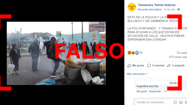 La imagen de un supuesto efectivo tirando el contenido de una olla popular con comida en la calle no es actual ni de nuestro país. La foto fue tomada en esa nación latinoamericana. Circula al menos desde 2012, en el marco de las protestas contra el proyecto “Conga” para la explotación de una mina aurífera.