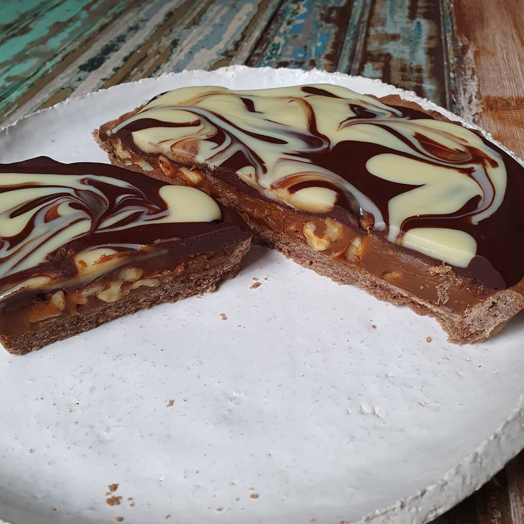 Llevar a horno medio 20 minutos. Rellenar con lo que quieran. Yo mezcle 300 gr de dulce de leche repostero con 100 gr de nueces picadas. Derretir 100 g de chocolate semi amargo con 50 g de manteca, poner por arriba de la tarta. Derretir 100 g de chocolate blanco con 50 ml de crema de leche y poner con una cuchara también por arriba de la tarta y hacer el dibujo que quieras. Llevar a la heladera mínimo por una hora.