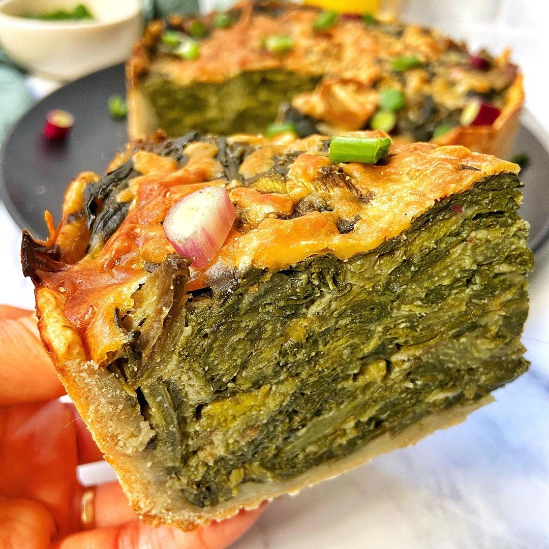 Para el relleno: Cortar las cebollas en rodajitas y la espinaca o acelga en tiras. Saltear en una sartén con unas gotas de oliva, condimentar a gusto y cocinar unos 4 a 5 minutos. Dejar enfriar el relleno y colocar dentro de la masa. Cubrir con queso (opcional) y llevar a un horno a 180º C por 25 a 30 minutos o hasta que vean los bordes de la tarta dorados.