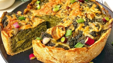 Para el relleno: Cortar las cebollas en rodajitas y la espinaca o acelga en tiras. Saltear en una sartén con unas gotas de oliva, condimentar a gusto y cocinar unos 4 a 5 minutos. Dejar enfriar el relleno y colocar dentro de la masa. Cubrir con queso (opcional) y llevar a un horno a 180º C por 25 a 30 minutos o hasta que vean los bordes de la tarta dorados.