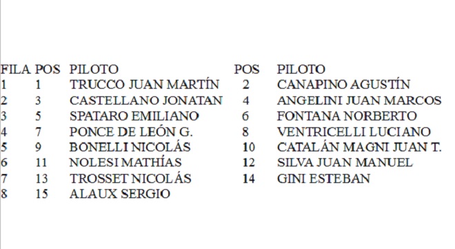 Las series están encabezadas por Gastón Mazzacane (Chevrolet) quien logró la pole position en la clasificación general y estará largando desde el primer cajón de la serie que iniciará las competencias del domingo.