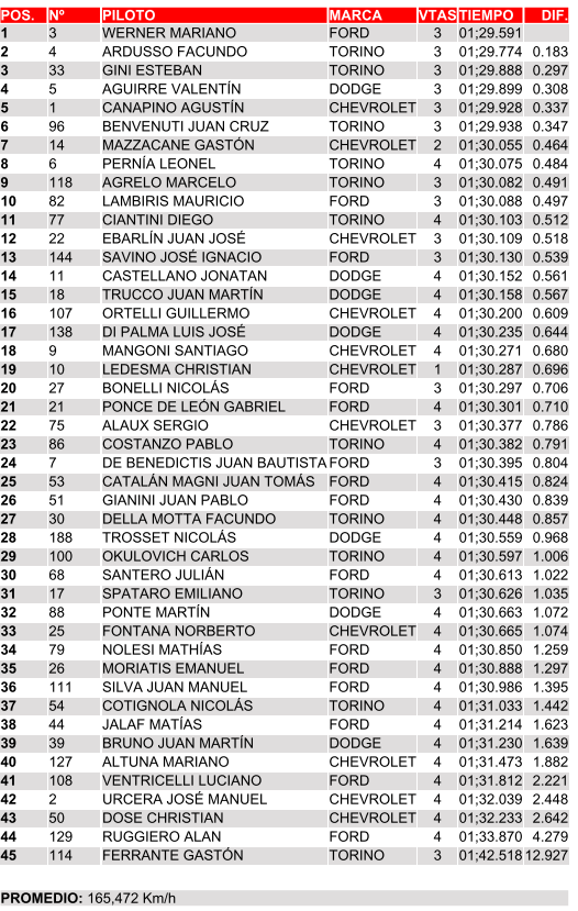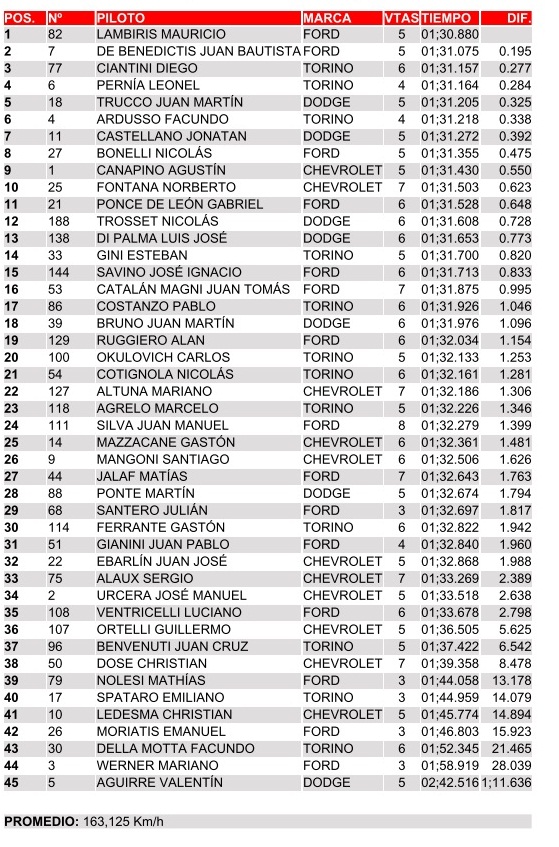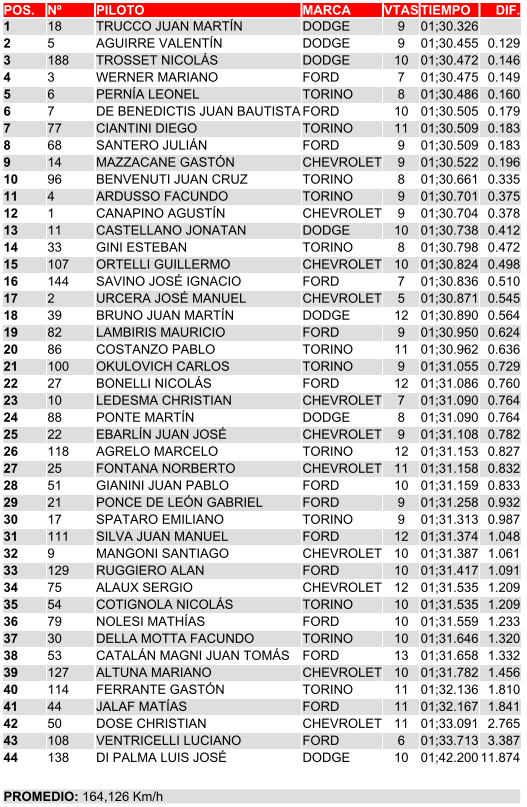 Trucco fue uno de los destacados de la segunda tanda de entrenamientos que cumplió la categoría y completó la vuelta en 1m 30s 32/100, superando a Valentín Aguirre, con otra Dodge, por 12/100.