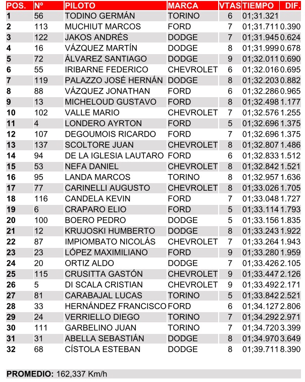 Todino, quien fue el destacado de los entrenamientos, completó su vuelta en 1m 30s 83/00, relegando a Federico Iribarne y a Santiago Álvarez.
