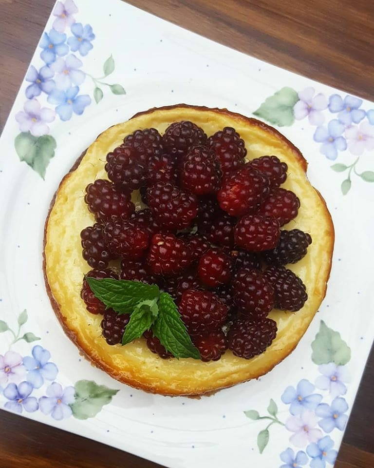 Volcar en el molde enmantecado y hornear unos 25-30 minutos hasta que los bordes estén dorados y el centro tiemble un poco, al igual que la cocción del cheesecake. Apagar el horno y dejar la torta adentro durante 1 hora. Retirar del horno y cuando esté a temperatura ambiente, guardar en la heladera durante al menos unas 3 horas antes de desmoldar y servir. Decorar con frutos rojos por encima.