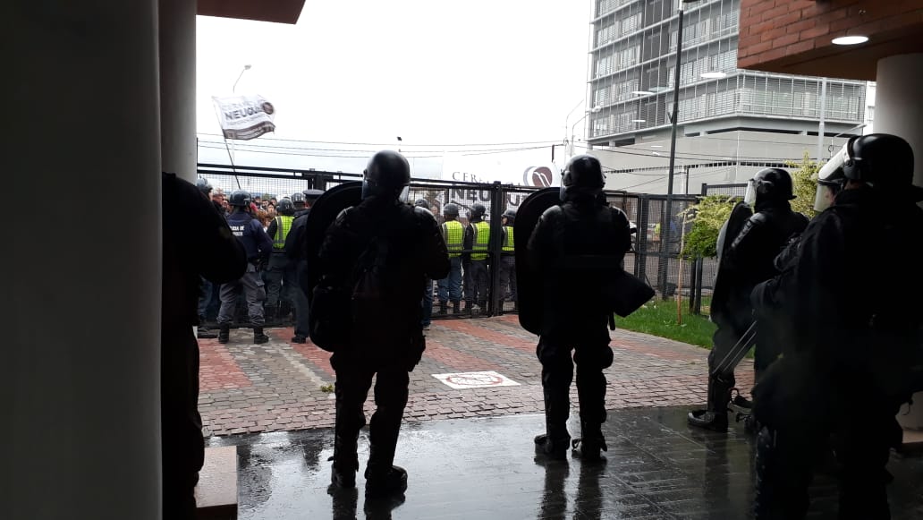 Los trabajadores que se manifestaban en la puerta del organismo exigiendo observar la sesión denunciaron que fueron reprimidos. Desde la conducción del sindicato de municipales Sitramune, Luis Martínez explicó que cuando intentaron ingresar la policía cerró las vallas, por lo que algunos manifestantes las saltaron y se inició la represión.
