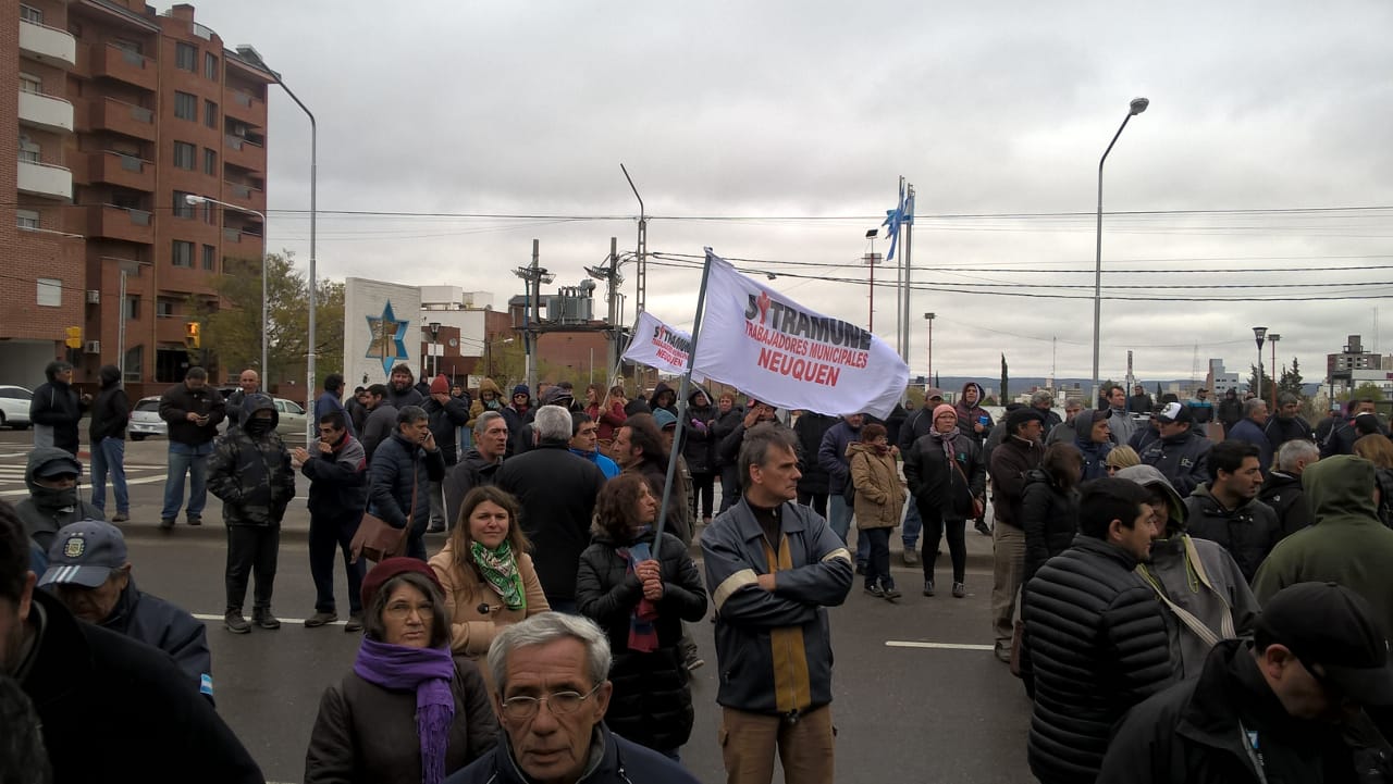 Los manifestantes permanecían en el lugar y se les unieron integrantes de ATE junto a su dirigente Carlos Quintriqueo, quienes expresaron su apoyo a los municipales “quienes rechazan el proyecto de reforma previsional del intendente Horacio Quiroga que aumenta la edad jubilatoria y los aportes”.