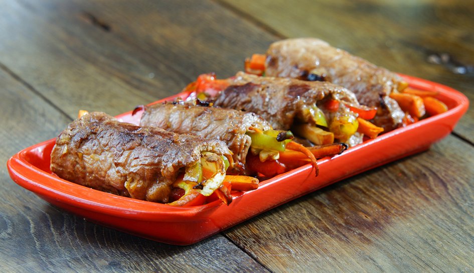 - Cortar la carne en fetas finas y los vegetales en tiritas. Saltear las verduras y condimentar. Envolver los vegetales con la carne y cocinar en la sartén o en el horno.
