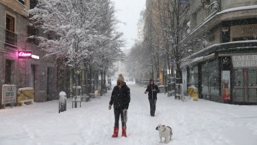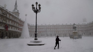 La nevada también dejó imágenes insólitas para muchos madrileños. Algunos se atrevieron a salir a la calle con sus equipos de esquí y recorrieron la principal avenida comercial de la capital, la Gran Vía, y la Puerta del Sol, y hubo hasta un trineo tirado por perros, según videos que circulaban por redes sociales.