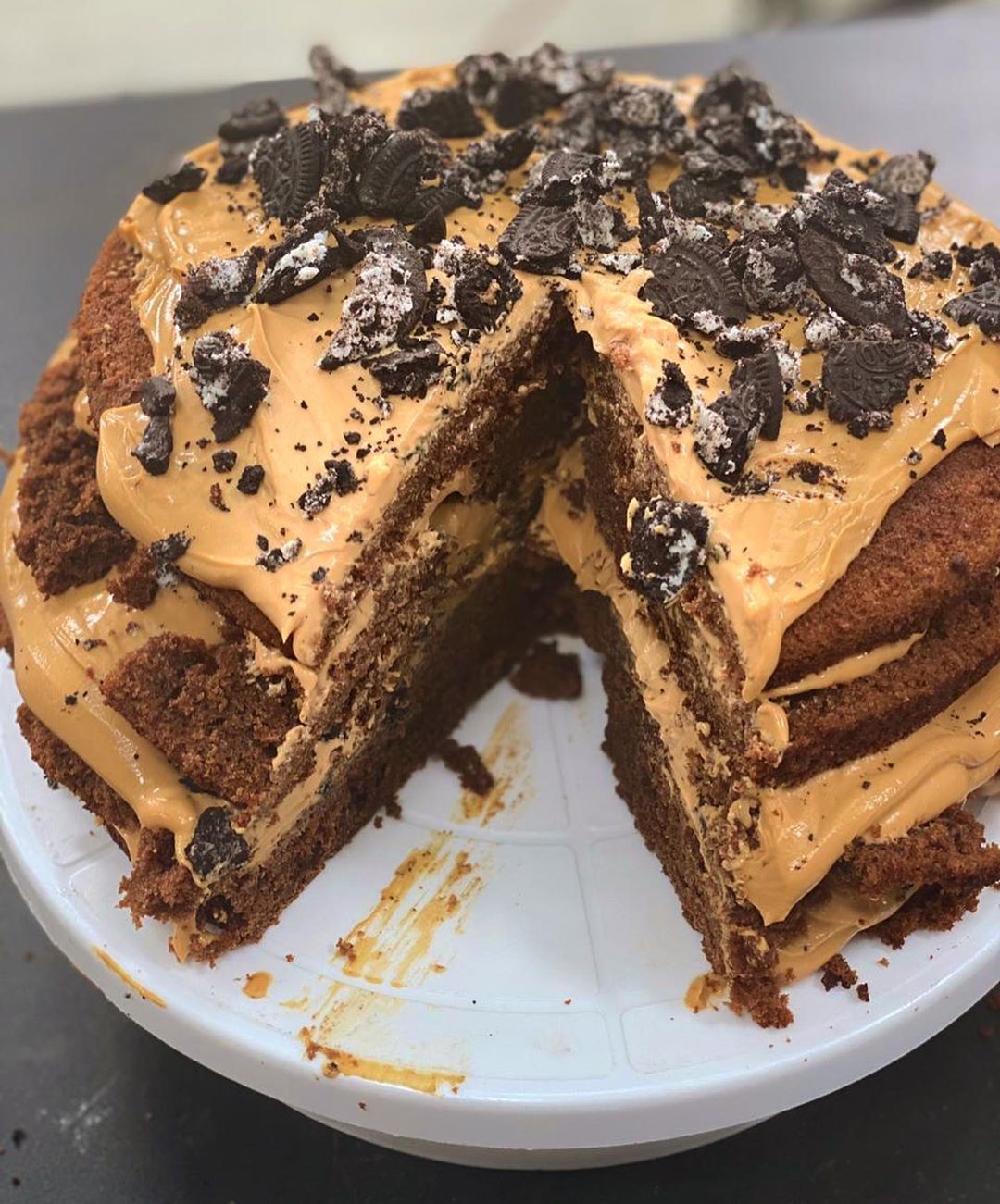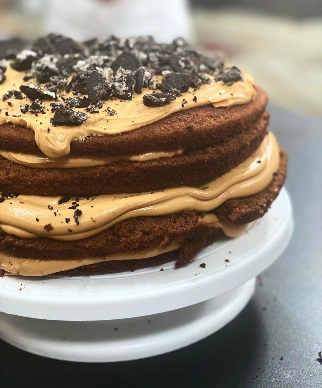 Recortar la parte superior de las tortas y cortar por la mitad cada una, tendremos 4 capas de torta. Colocar una capa de torta y untar con la crema de dulce y las galletitas molidas por arriba. Repetir con las capas restantes y termine con la crema de dulce de leche y galletitas rotas.