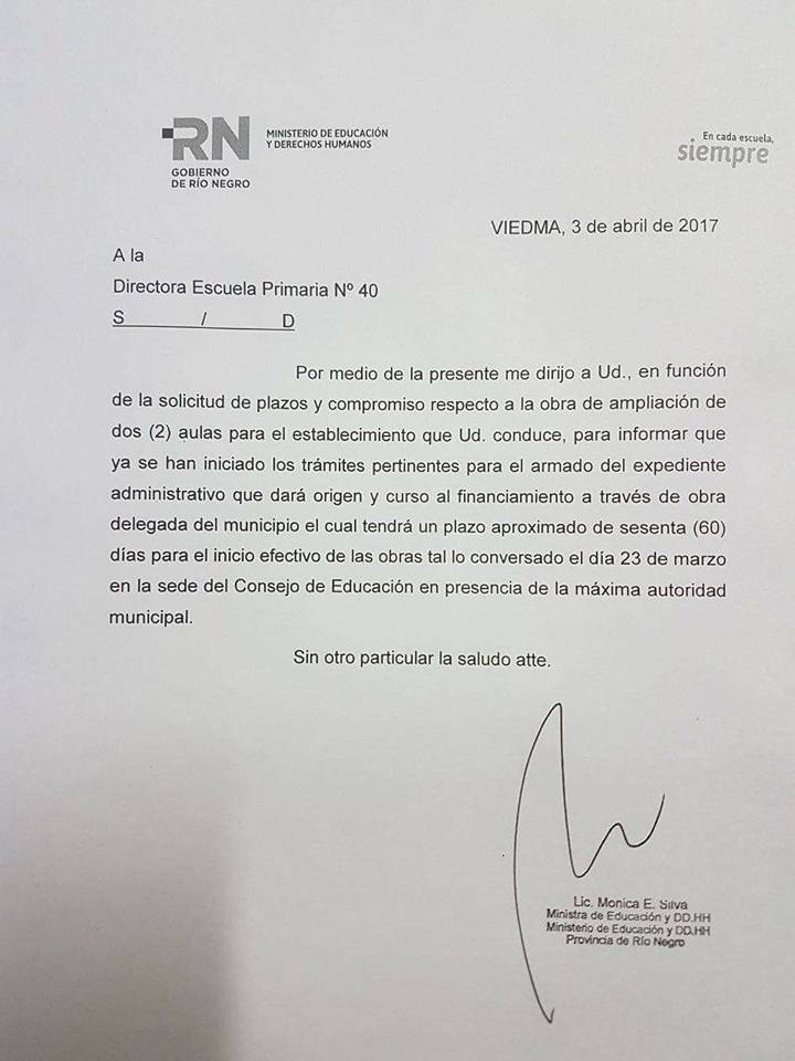 En el documento se especifica un plazo de 60 días desde ayer, para concretar la ampliación de dos aulas, que serán destinadas a una sala de 4, en el jardín anexo, y para un cuarto grado, que se desdoblara por la gran cantidad de alumnos.