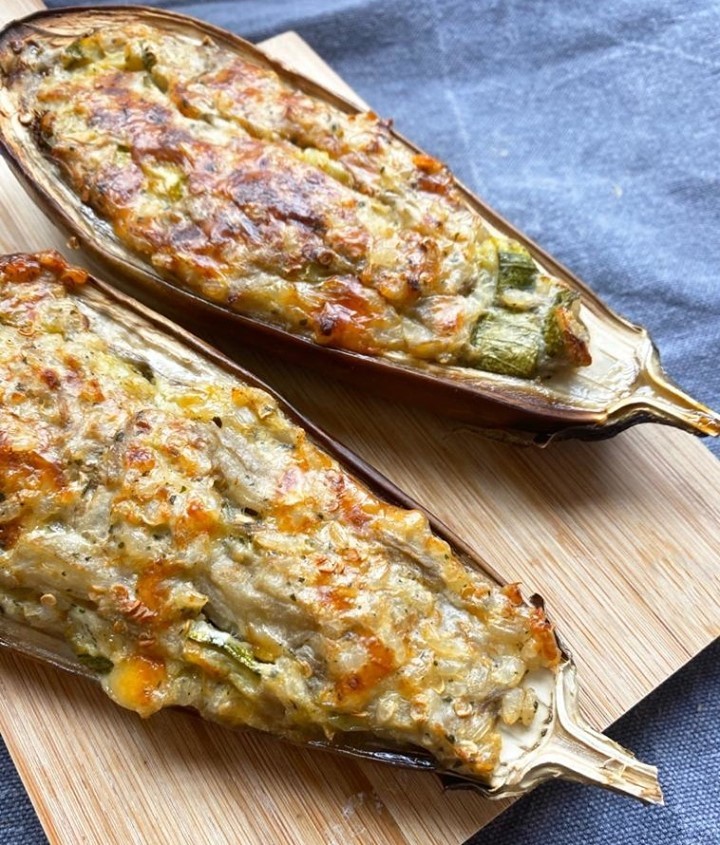 Para el relleno picamos muy bien la pulpa y la salteamos con cualquier verdura o cereal que tengas esperando en la heladera. Yo usé 1 zucchini y apenas de arroz cocido. Una vez que todo está bien salteado agregamos 1 huevo y 50 gramos de queso pategrás rallado grueso. Rellenamos las berenjenas y las llevamos nuevamente al horno por otros 20 minutos para que terminen su cocción y se doren.