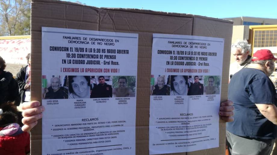 Colocaron un cartel en el enrejado del edificio donde pidieron respuestas, acompañados también por la familia de Magdalena Curraqueo, otra mujer desaparecida en Roca desde el 23 de febrero.