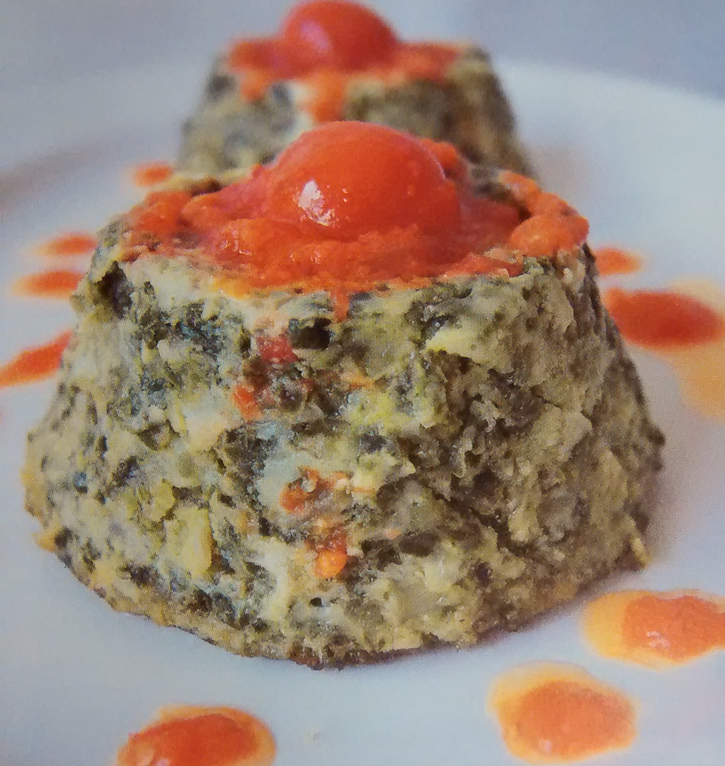 Mezclar las acelgas crudas y picarlas con el queso y los huevos. Salpimentar a gusto y poner en flaneritas previamente aceitadas. Hornear los budines, a baño de María y en horno mediano durante 45 minutos. Calentar la salsa de tomate, sobre un espejo de aceite, y pasar rápidamente los tomates para que tomen brillo. Dejar enfríar y desmoldar los budincitos. Rellenar el hueco del medio con salsa y los tomatitos. Servir de inmediato.