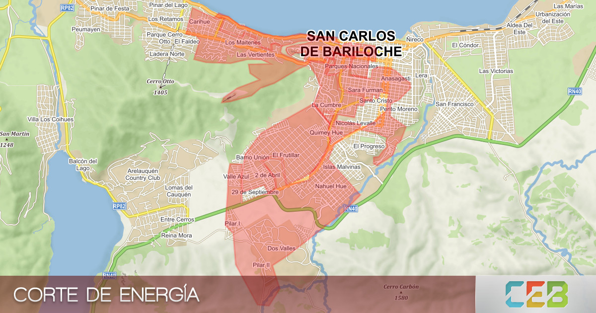 La Cooperativa de Electricidad Bariloche informó temprano el corte que afectaba al centro de la ciudad y los los barrios Furman, Belgrano Sudeste, Anasagasti, Las Quintas, Santo Cristo, Nueva Esperanza, Las Mutisias, 6 Manzanas, Vivero, 153 Viviendas, 169 Viviendas, 170 Viviendas, 181 Viviendas, 10 de Diciembre, Jardín Botánico, Las Margaritas, Bº 300 Viviendas, Alto Jardín Botánico, La Cumbre, Vuriloche l, Vuriloche IV, 144 Viviendas, Alborada, 3 de Mayo, 96 Viviendas, Unión, El Frutillar, 2 de Abril, 40 Viviendas, 29 de septiembre, Valle Azul, 645 Viviendas, San Joaquín, Belgrano, Centro, Los Cipresales, Los Maitenes, Melipal, Valle Azul, Pilar I, Pilar II, Dos Valles, 112 Viviendas, Nahuel Hue, El Maitén, Cooperativa 258, Quimey Hue, Rayen Mapu, Carihue, Melipal, Los Maitenes y Las vertientes.