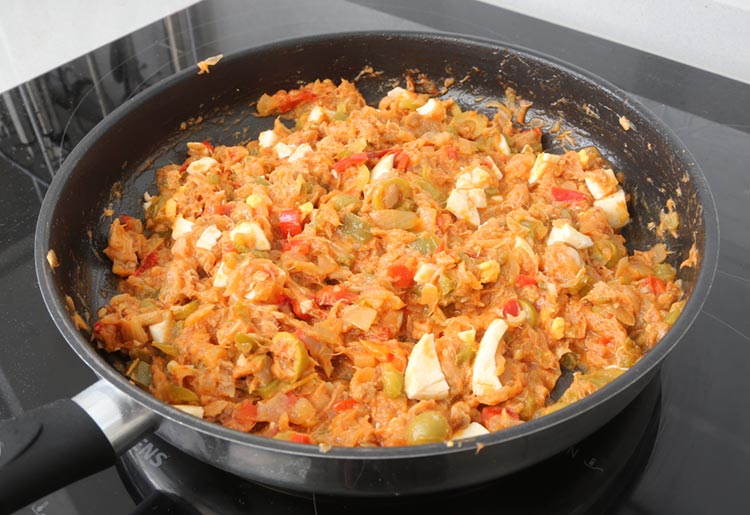 Incorporar la merluza cortada en pequeños cubos y cocinar unos minutos. Añadir el atún y las aceitunas (descarozadas y picadas). Condimentar con sal, perejil y pimentón. Reservar.