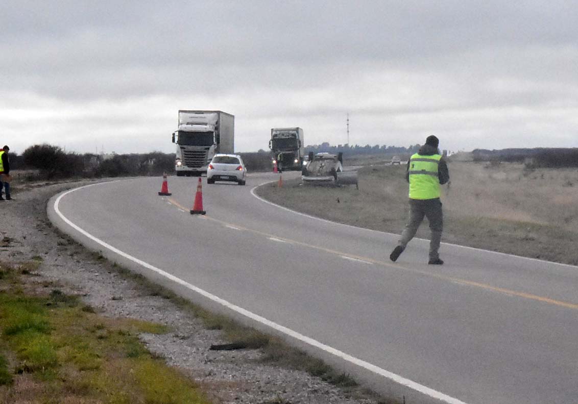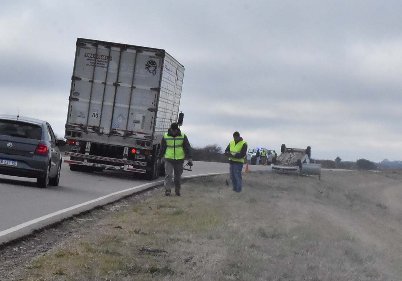 La policía científica de la provincia vecina trabaja en el lugar para determinar las circunstancias del siniestro, que provocaron el despiste y vuelco del auto que tras dar un par de tumbos quedó en posición invertida con sus cuatro ruedas hacia arriba, en la banquina a la que circulaba.
