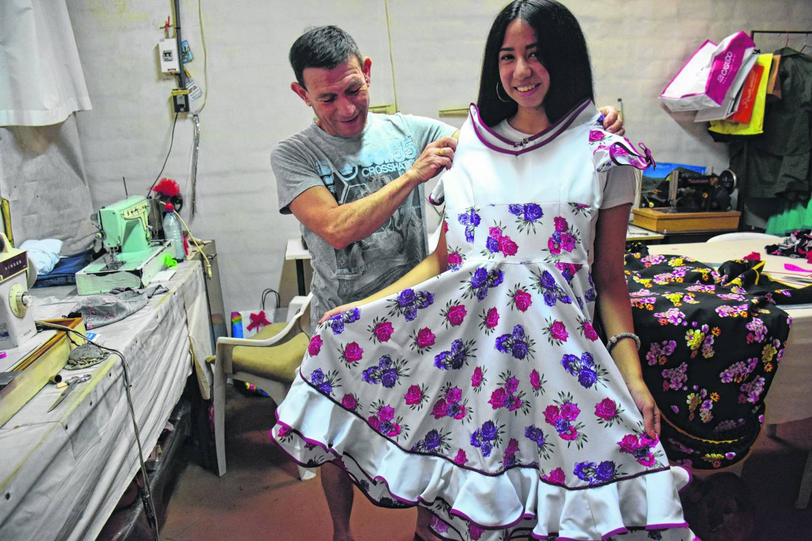 Iván también confecciona prendas a pedido de organizaciones, como grupos de folklore, a escuelas privadas, a coros de iglesias evangélicas. Cuando llega un cliente a verlo, generalmente ya trae pensado el modelo de vestido o traje que quiere.