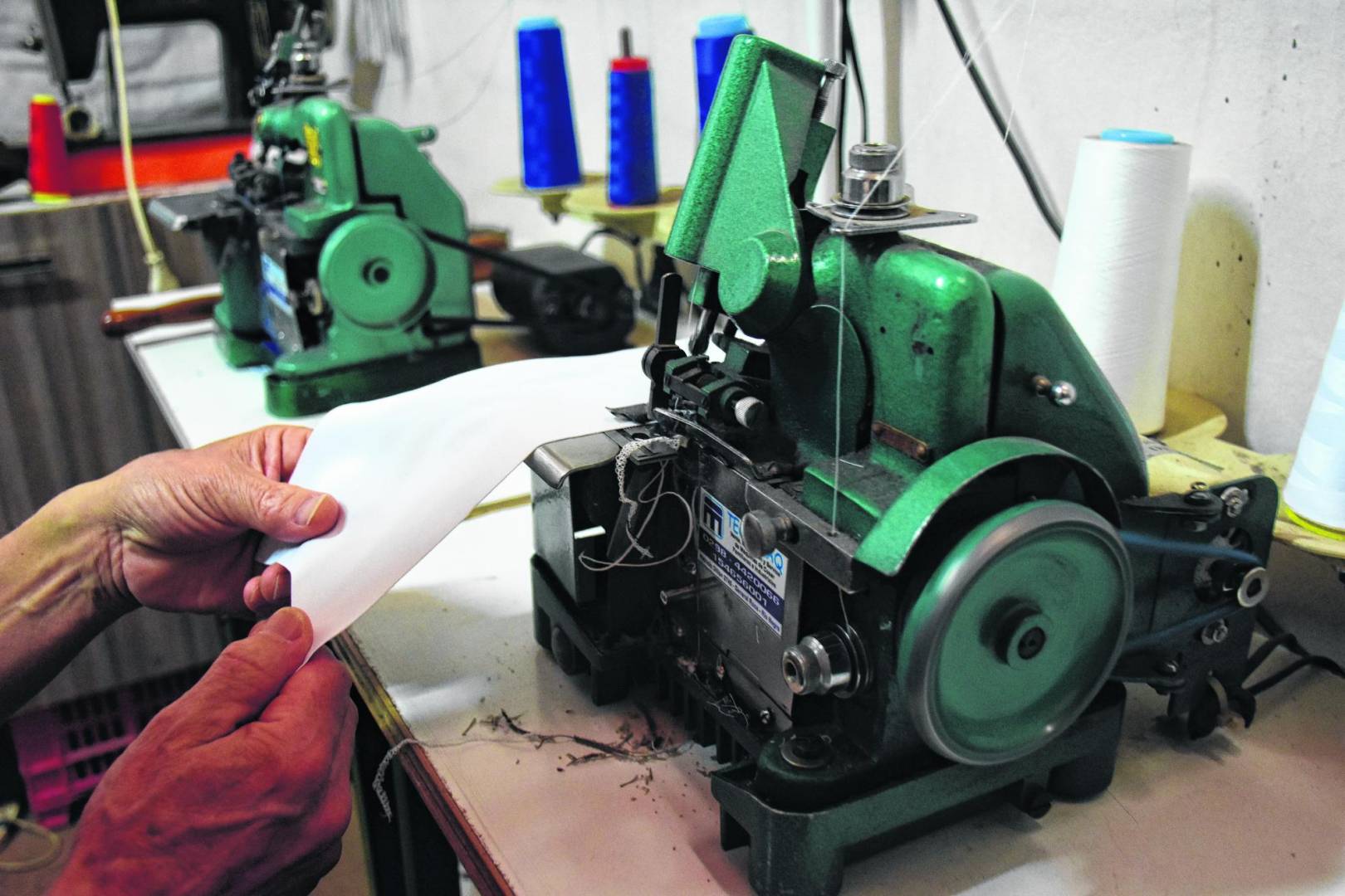Les cobra el trabajo pero los clientes tienen que llevar la tela. “Les especifico la cantidad y la calidad”, explica. En su taller tiene varias máquinas overlock que compra en el país y otras que usa para trabajar el cuero.