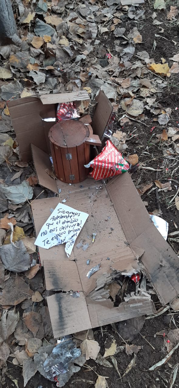 Una vez en el exterior, se procedió a hacer explotar la caja, para descubrir que adentro había otra, de madera. Esta nueva caja cilíndrica también fue detonada. Con esta acción quedó al descubierto su contenido: fotos y cartas que serán investigadas por la comisaría quinta, de la localidad.