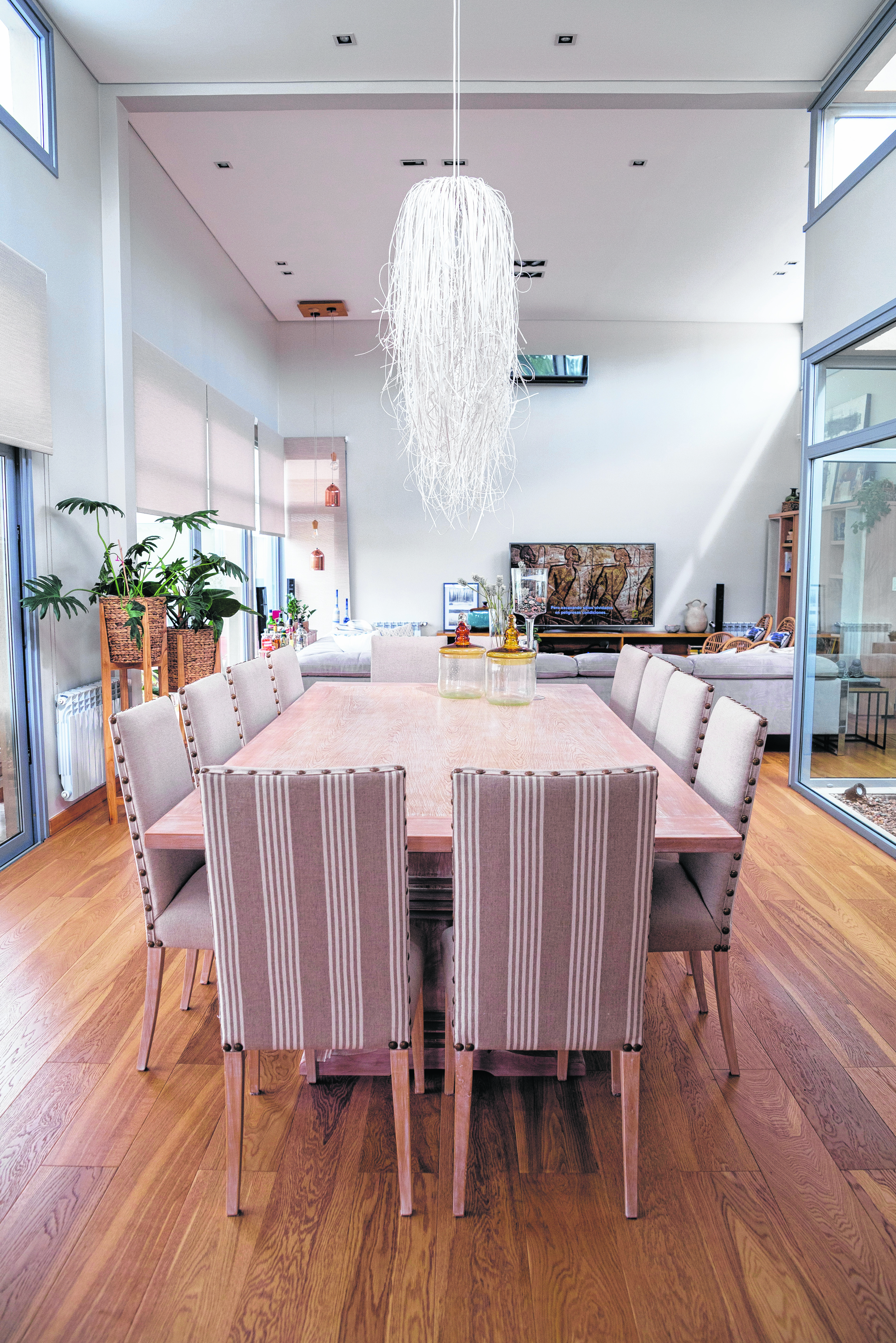 El comedor consta de una mesa de madera maciza acompañada de doce sillas clásicas tapizadas en lino liso y rayado. Completan el mismo espacio dos lámparas colgantes muy informales. El exterior consta de un gran jardín con pileta, una galería con zona de relax y parrilla. Todo con vista al campo de golf. Además en un lateral hay una huerta y en el frente otra gran zona de jardín.