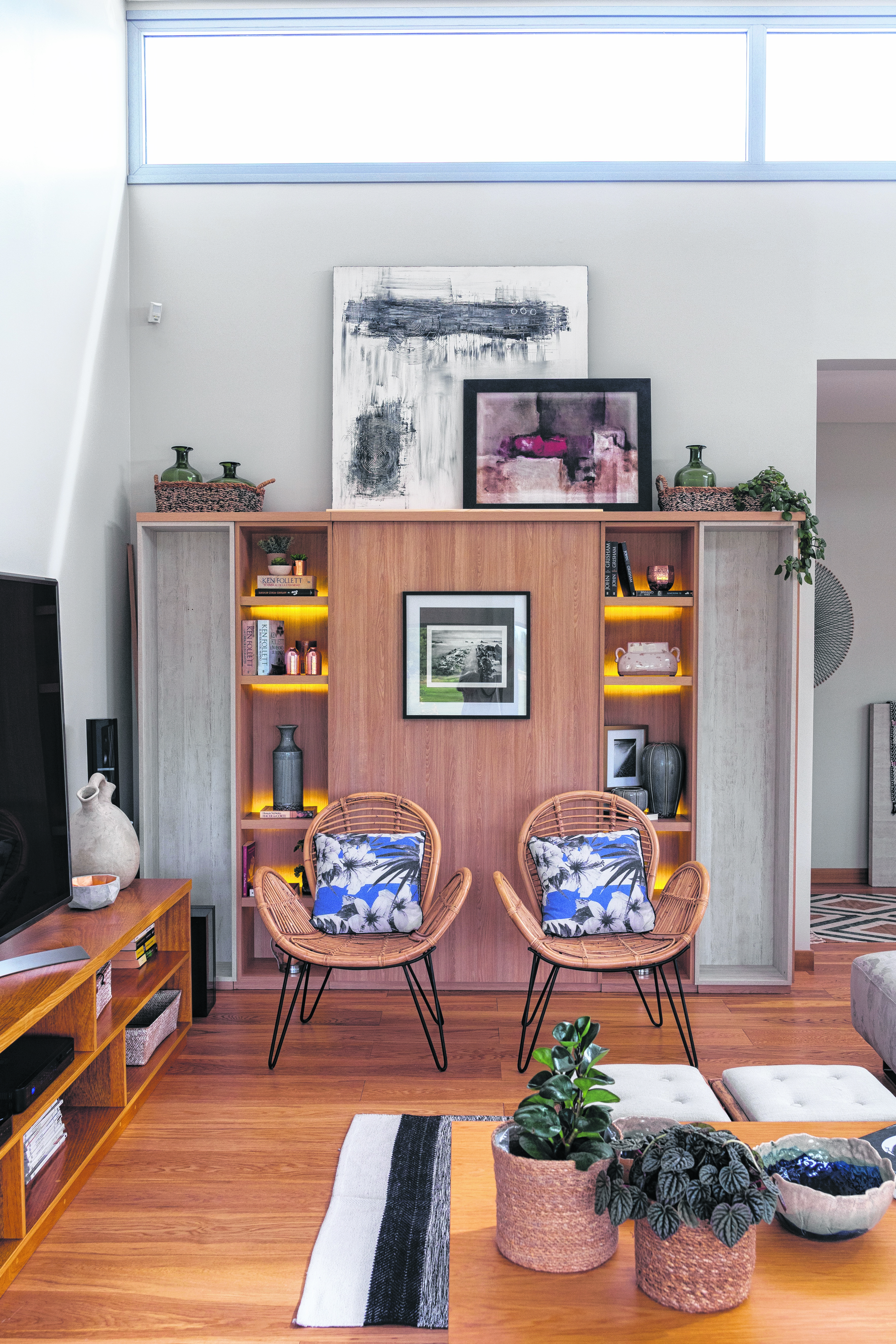 El living comedor se divide en living propiamente dicho con rinconero para relax, reuniones y zona de plasma. En un lateral hay un mueble con luz que destaca los objetos y obras de arte que se ubican en el mismo. Dos sillones de ratán completan el living junto a varias mesas bajas.