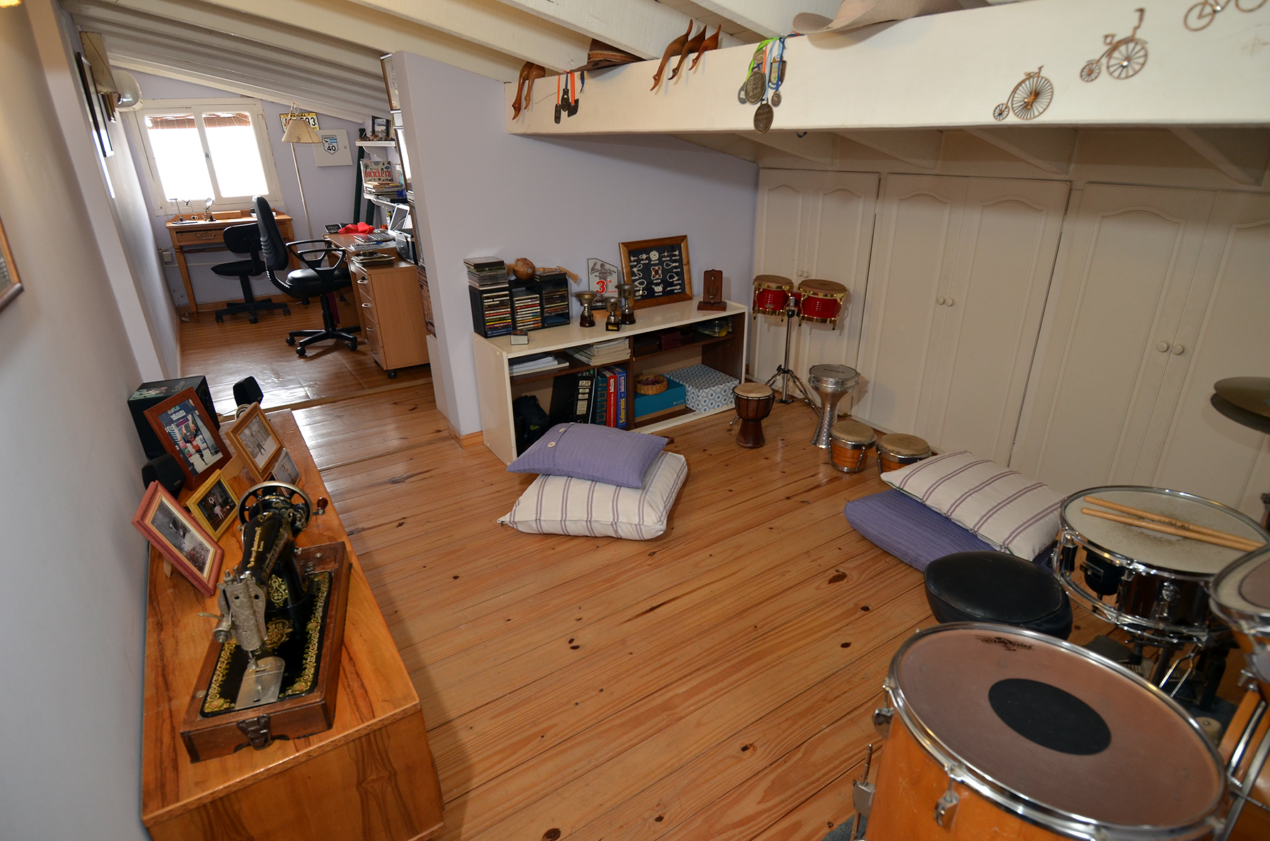 Sin posibilidad de incrementar más superficie en planta baja ( vivienda entre medianeras ) se buscó utilizar el espacio entre el cielorraso y el techo, creando un altillo con acceso desde el living , donde se ubicó una pequeña oficina, la mesa de armado de pesca, la batería y un sector para realizar yoga, además de nuevas superficies de guardado.