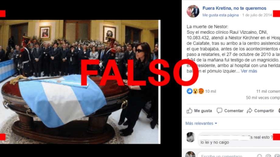 En los últimos días (ver acá y acá) volvió a circular un texto en Facebook de 2014, que desde ese año tiene 10 mil reacciones y fue compartido más de 50 mil veces, firmado por un supuesto doctor Raúl Vizcaíno. En él asegura haber atendido a Néstor Kirchner el día de su muerte, el 27 de octubre de 2010, y afirma que el cuerpo del ex presidente presentaba una herida de bala en su rostro y que por eso se trató de un magnicidio (muerte violenta dada a persona importante por su cargo o poder). Un chequeo de Reverso permite determinar que esas afirmaciones, que ya habían trascendido en años anteriores (ver acá, acá y acá), son falsas.