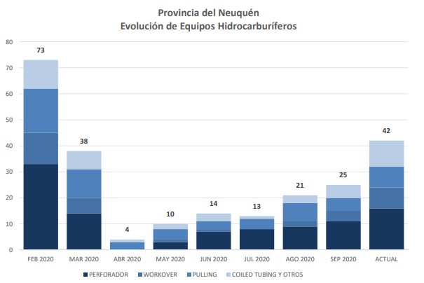 En febrero, el último mes sin afectación por la cuarentena nacional, en Neuquén operaban 33 equipos perforadoras, es decir que actualmente los rigs apenas alcanzan a la mitad de lo que hubo en ese mes. En tanto que en general, en febrero eran 73 los equipos activos, ya que la reactivación en coiled tubing se encuentra casi a valores normales y los workover están operando a un 75% del nivel prepandemia.