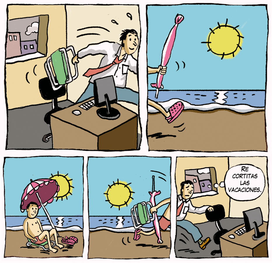 "Vacaciones" el capítulo 375 de Viajeros, la tira de Chelo Candia que publica el Voy, suplemento de viajes y turismo de Río Negro.