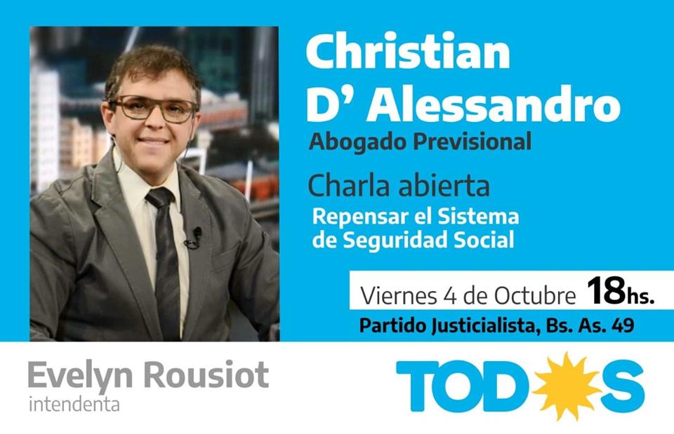 La lista del Frente de Todos, que encabeza la concejal Evelyn Rousiot, hará el cierre este viernes a las 18 en la sede del PJ de Buenos Aires 49, con la presencia del destacado abogado Christian D’Alessandro, especialista en temas previsionales, quien ofrecera una charla abierta para “Repensar el Sistema de Seguridad Social”.