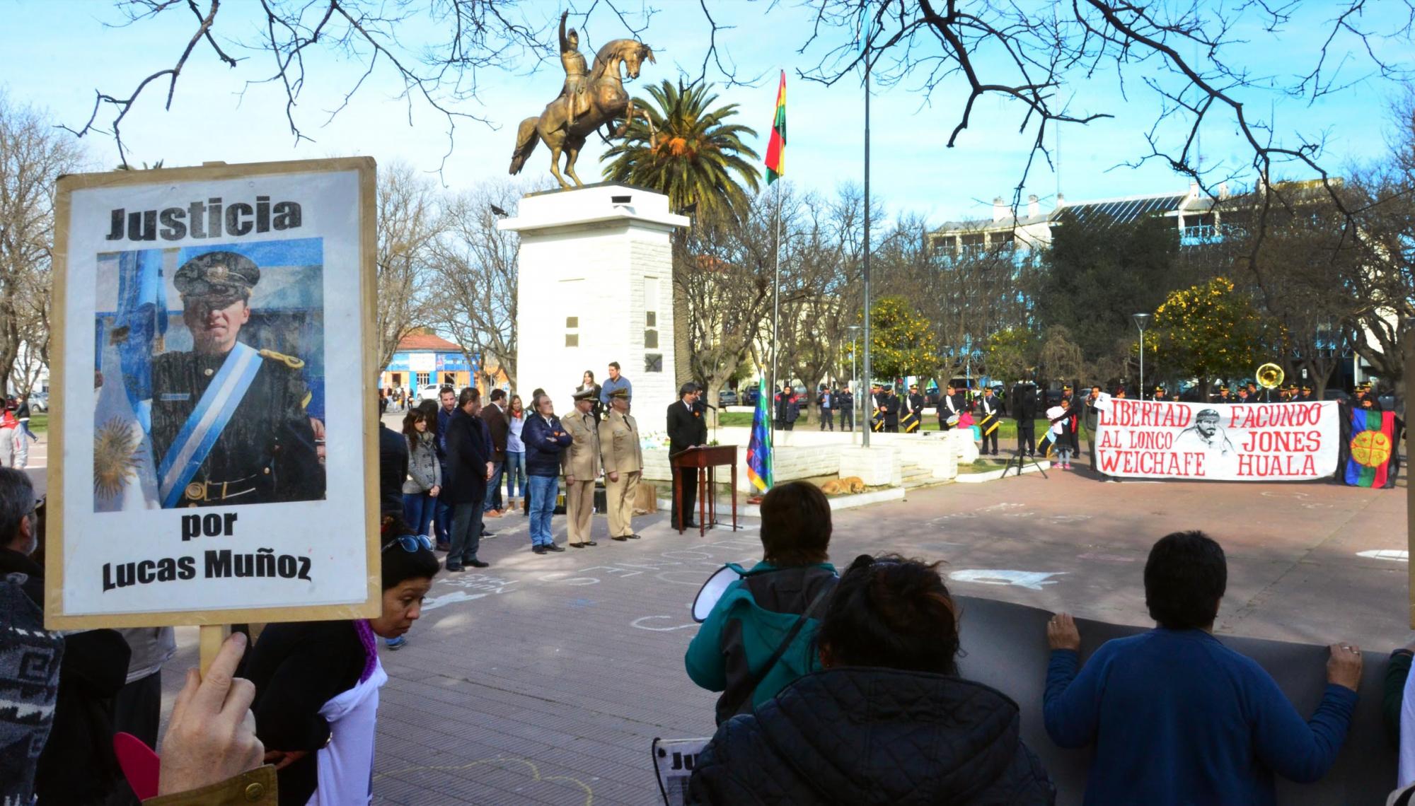 En segundos todo fue una gran confusión. Entre los gritos de uno y otro sector de los grupos de manifestantes se podía escuchar con claridad el nombre de “Lucas” de parte de los familiares del policía Muñoz que portaban un megáfono y los encendidos reclamos de representantes de la comunidad mapuche, a quienes se sumó la marcha a Malvinas ejecutada por la Banda de Música de la Policía mientras se retiraba por uno de los laterales de la plaza en dirección a la Casa de Gobierno. Las autoridades hicieron lo propio hacia el municipio junto al intendente, José Luis Foulkes.