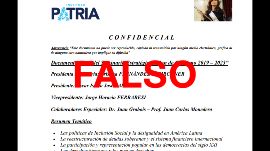Desde el viernes último circula en Whatsapp (ver acá y acá) un archivo en formato PDF de un supuesto “Seminario Estratégico ‘Plan de Gobierno 2019 – 2023’”. El documento tiene el logo del Instituto Patria y una imagen de su fundadora y líder, la ex presidenta y candidata a vicepresidente por el Frente de Todos, Cristina Fernández de Kirchner. Debajo de la palabra “confidencial” se lee: “Advertencia ‘Este documento no puede ser reproducido, copiado ni transmitido por ningún medio electrónico, gráfico ni de ninguna otra naturaleza que implique su difusión’”. Reverso pudo determinar que este documento es falso.