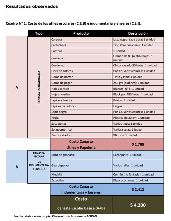 El informe detalla que el costo de la Canasta Escolar Total en febrero de 2019 es de 4.200 pesos, un 36 por ciento más alto que febrero de 2018.