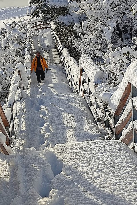 «Ella estaba feliz, caminaba por las pasarelas nevadas y no podía creer el panorama», cuenta Carlos. Los copos blancos también se posaban sobre las ramas de los árboles y detrás, como salido de un sueño, aparecía el glaciar en toda su deslumbrante dimensión, con ese solcito que se asomaba para que todo se viera aún más lindo.