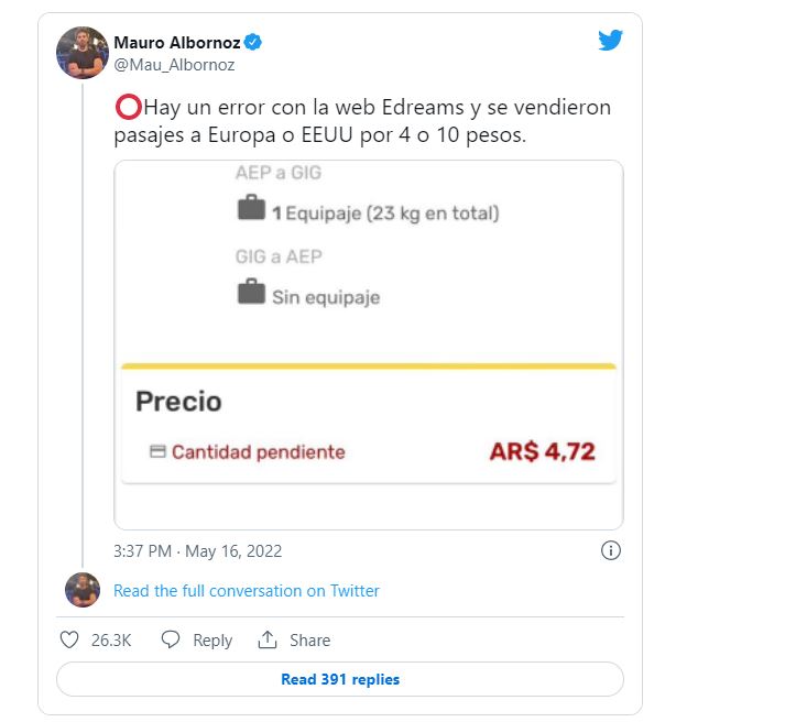 Debido a un fallo de la página web eDreams, muchos usuarios aseguraron que pudieron comprar tickets de avión a precios irrisorios. Ahora sueñan con volar a Europa o Estados Unidos por la módica suma de 10 pesos argentino. La situación se volvió viral en redes donde varios se jactaron de aprovechar el fallo mientras que otros se lamentaron por no llegar a tiempo.