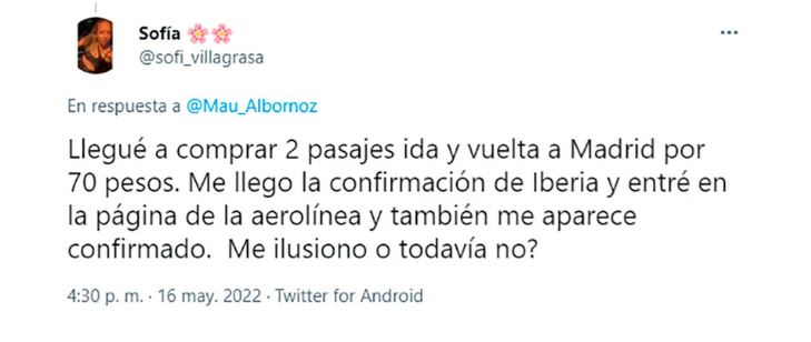 Muchos se ilusionan con poder viajar por ese poco dinero. «A los que tenemos la reserva confirmada por eDreams y nos aparece en la página de la aureolina nuestro vuelo, ¿me avisan si surge alguna novedad? Por el momento estaría viajando más barato que lo que sale tomarse un colectivo», dijo una usuaria.