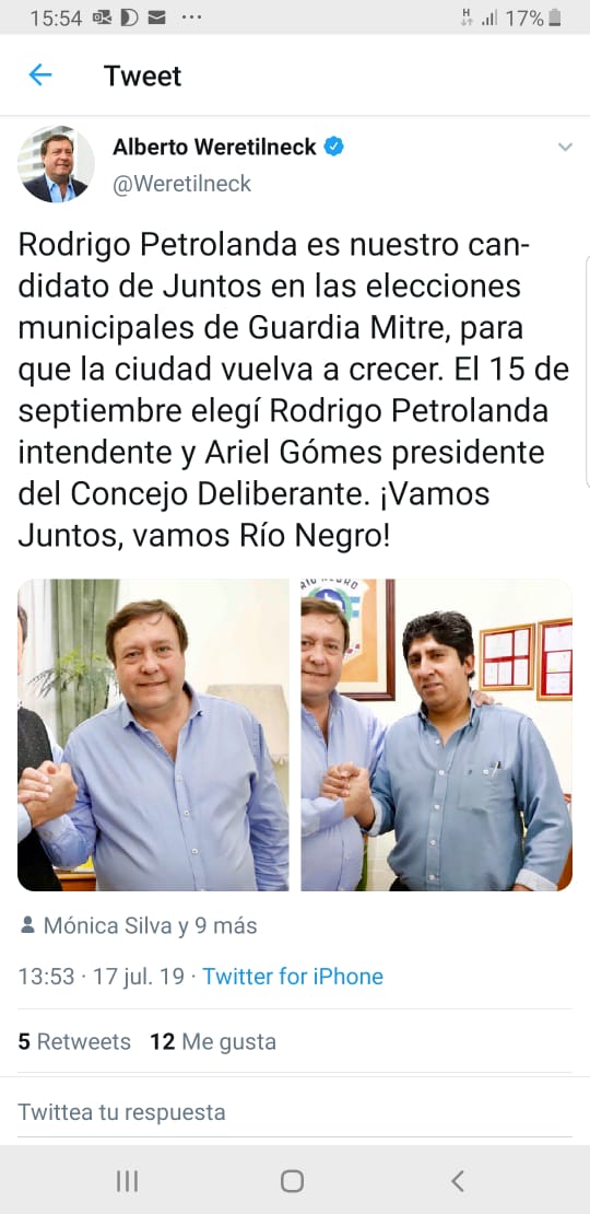 El gobernador Alberto Weretilneck hizo público su respaldo a Rodrigo Petrolanda, como candidato a intendente por Juntos Somos Río Negro; y a Ariel Gómes, para presidir el Concejo Deliberante; en las elecciones de Guardia Mitre previstas para el 15 de septiembre próximo.