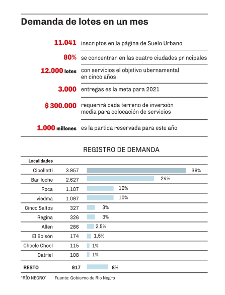 En tres semanas, el registro de demanda de Suelo Urbano llegó a 11.041 inscriptos. Río Negro apura para disponer y regularizar tierras de los municipios. Se ratifica un plan de recupero con cuotas mensuales, a través de la Agencia de Recaudación.