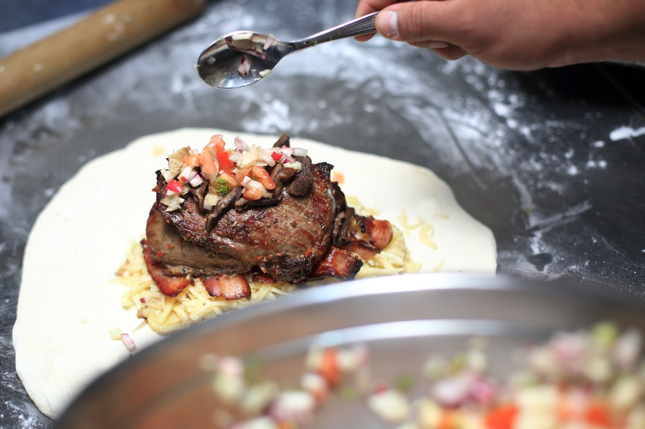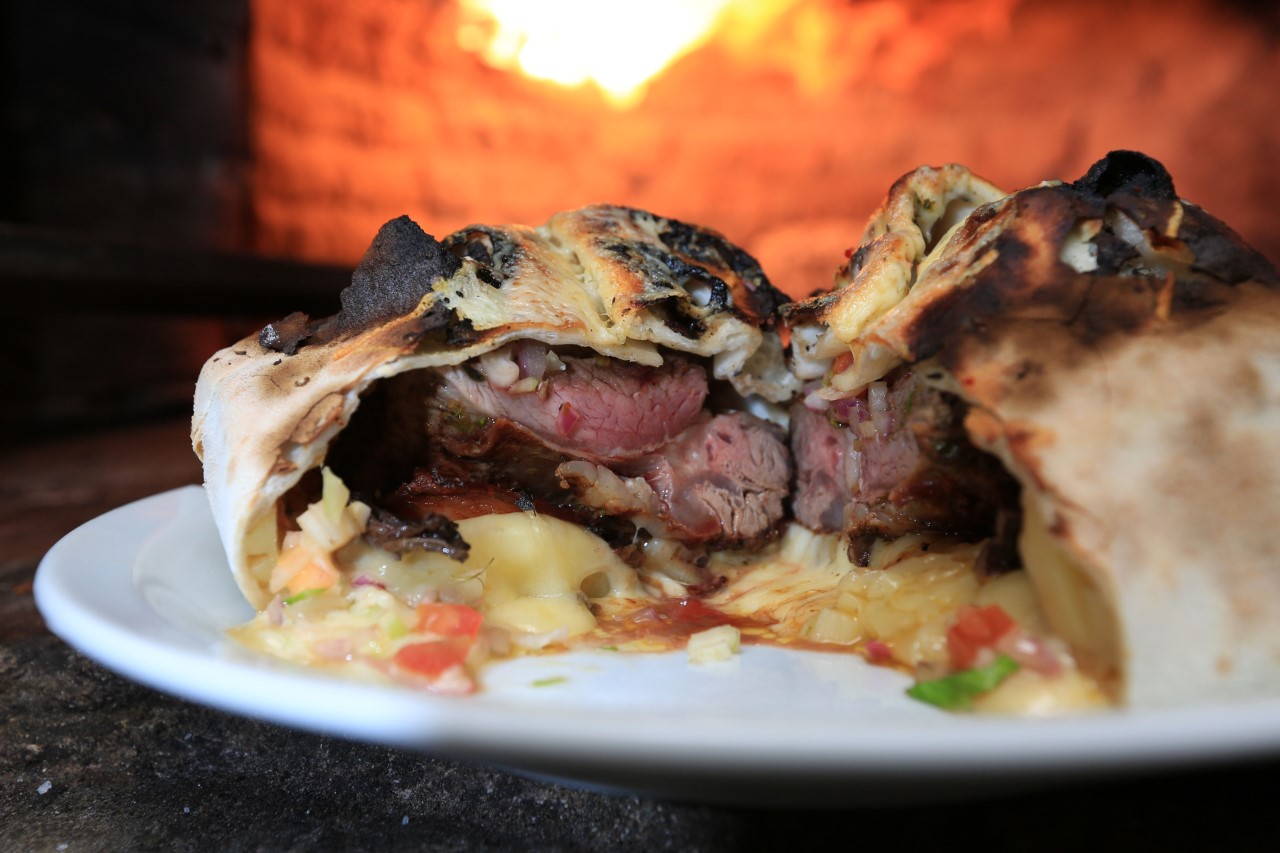 Noches atrás lo entrevistamos en su lugar de trabajo, en una noche bien fresquita que se prestaba para comer un lomo embuchado crocante al horno de barro. “Elegí un lomo de ternera patagónica, de una cabaña chica de Río Colorado. Lo envolví en una masa de doble fermentación, con queso de cabra y vegetales. El relleno varía según el producto fresco de mercado. Todo esto lo llevé al horno de barro y acá está”.